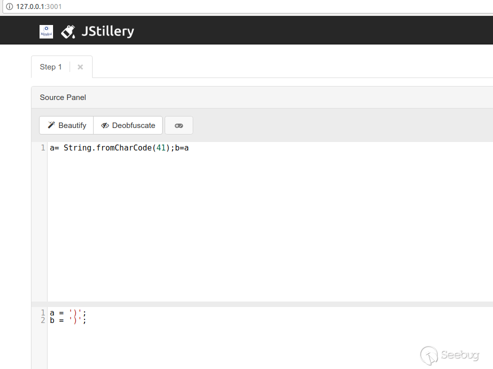 echo 'a= String.fromCharCode(41);b=a'| ./jstillery_cli.js