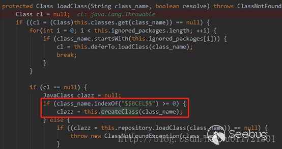觸發點就很明顯了,就是Class.forName的時候。這里的driverClassName和driverClassLoader都是有setter方法的,所以我們直接可以從json串里傳入。這里加載惡意字節碼使用了Apache BCEL這個庫,這個庫主要用于字節碼操作,并且已經嵌入到JDK源碼中。漏洞觸發的關鍵在于com.sun.org.apache.bcel.internal.util.ClassLoader這個classloader的loadClass方法,我們看一下是如何處理字節碼的: