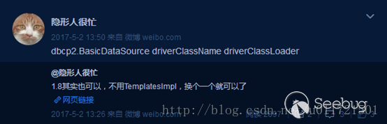 這里我不得不先介紹一下dbcp這個gadget,在CVE-2017-7525時,官方并沒有添加到黑名單中,而是從CVE-2017-17485爆出后才加入list。該Gadget是利用了org.apache.tomcat.dbcp.dbcp2.BasicDataSource,該類在tomcat-dbcp.jar中。當時jackson首次爆出漏洞后,很多人的目光投向了TemplatesImpl這個Gadget,但是這個Gadget的利用受到了JDK版本的限制,導致在JDK 8下不是很好用。當時我也提到了這個Gadget: