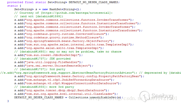 歷史上Jackson的反序列化漏洞以及繞過主要是CVE-2017-7525 和 CVE-2017-17485。而針對反序列化漏洞的防護,jackson主要采用了黑名單機制,通過限制反序列化的類名稱來進行防護。黑名單列表在com.fasterxml.jackson.databind.jsontype.impl.SubTypeValidator類中: