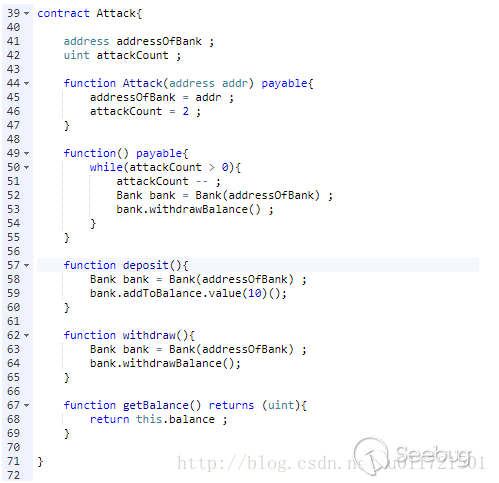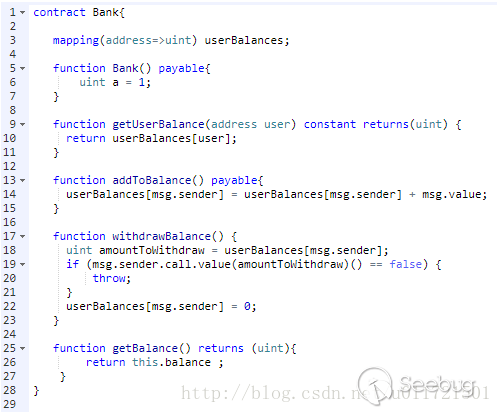 這里的deposit函數是往Bank合約中發送10wei。withdraw是通過調用Bank合約的withdrawBalance函數把以太幣提取出來。注意看這里的fallback函數,這里循環調用了兩次Bank合約的withdrawBalance方法。