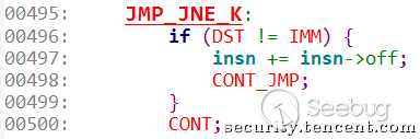 再看下eBPF運行時對BPF_JMP|BPF_JNE|BPF_IMM指令的解釋(__bpf_prog_run),顯然當imm為有符合和無符號時,因為sign extension,DST!=IMM結果是不一樣的。