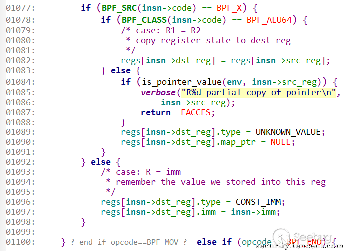 我們再來看下vefier中以下代碼(check_cond_jmp_op),這段代碼是對BPF_JMP|BPF_JNE|BPF_IMM指令進行檢查,這條指令的語義是:如果目的寄存器立即數==指令的立即數(insn->imm),程序繼續執行,否則執行pc+off處的指令;注意判斷立即數相等的條件,因為前面ALU指令對32bit和64bit integer不加區分,不論imm是否有符號,在這里都是相等的。