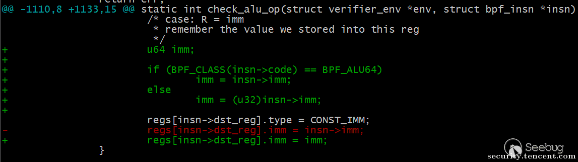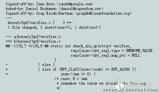 我們再看下upstream kernel 4.4.123的修復,相比之下,要簡潔的多,僅有3行代碼改動[12]: 當處理32bit ALU指令時,如果imm為負數,直接忽略,認為是UNKNOWN_VALUE,這樣也就避免了前面提到的verifer和運行時語義不一致的問題。