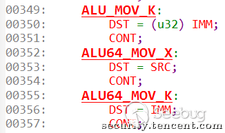 參考以下代碼,上面2條ALU指令分別對應ALU_MOV_K和ALU64_MOV_K,可以看出verifier和eBPF運行時代碼對于2條指令的語義解釋并不一樣,DST是64bit寄存器,因此ALU_MOV_K得到的是一個32bit unsigned integer,而ALU64_MOV_K會對imm進行sign extension,得到一個signed 64bit integer。