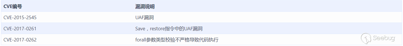 2017年5月7日FireEye研究員在文章EPS Processing Zero-Days Exploited by Multiple Threat Actors中披露了多個EPS 0-day漏洞的在野利用,其中就包含CVE-2017-0262,CVE-2017-0262為ESP中forall指令中的一處漏洞,由于forall指令對參數校驗不當,導致代碼執行。