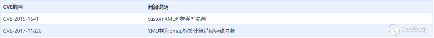 2015年4月,微軟修補了一個CVE編號為CVE-2015-1641的Office Word類型混淆漏洞。Office Word在解析Docx文檔displacedByCustomXML屬性時未對customXML對象進行驗證,造成類型混淆,導致任意內存寫,最終經過精心構造的標簽以及對應的屬性值可以造成遠程任意代碼執行。這是第一個利用成功率非常高且被APT組織頻繁使用的OOXML類型混淆漏洞。