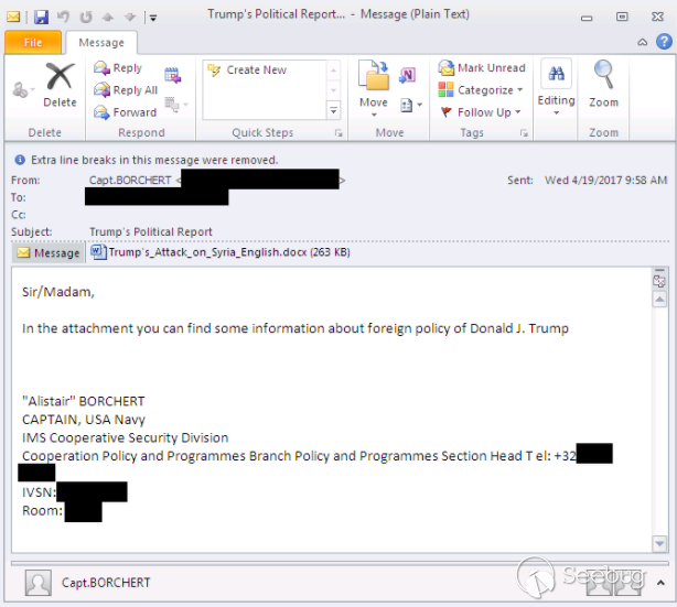 APT28組織通過發送魚叉郵件(CVE-2017-0262/ CVE-2017-0263)攻擊影響法國大選,郵件為附件為一個名為Trump’s_Attack_on_Syria_English.docx的Office文件,導致當時馬克龍競選團隊多達9G的數據被上傳到外網。