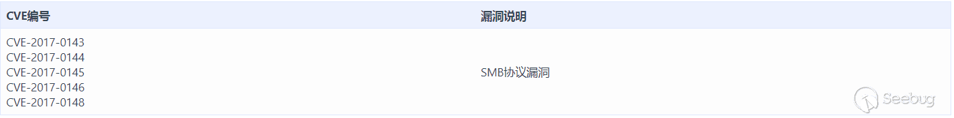 Shadow Brokers泄露的SMB攻擊工具,通過MS17-010補丁進行修補,其中涵蓋CVE-2017-0143,CVE-2017-0144, CVE-2017-0145, CVE-2017-0146,CVE-2017-0148五個漏洞,包含幾處SMB協議中的缺陷,通過相互組合從而形成了Shadow Brokers泄露工具中針對SMB協議的永恒系列武器。