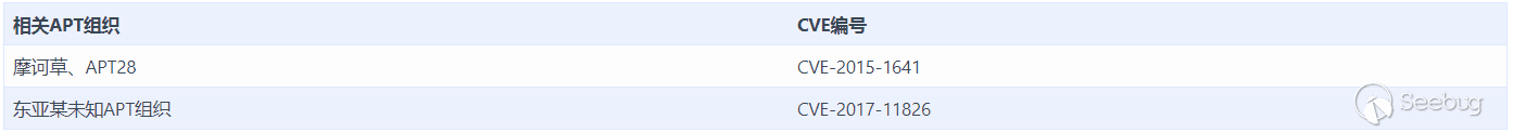 CVE-2015-1641相關的利用技術早已公開,且該漏洞利用的成功率非常高,所以該漏洞在Office OLE2Link邏輯漏洞還未曾風靡之前是各大APT組織最常用的Office漏洞之一。