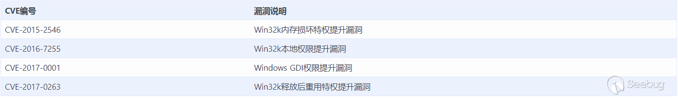 在對Office辦公軟件的EPS(Encapsulated Post Script)組件進行漏洞攻擊的過程中,由于Office 2010及其高版本上的EPS腳本過濾器進程fltldr.exe被保護在低權限沙盒內,要攻破其中的低權限沙盒保護措施,攻擊者就必須要使用遠程代碼執行漏洞配合內核提權漏洞進行組合攻擊。所以我們選擇Win32k.sys中的本地權限提升漏洞(CVE-2017-0263)這一個配合EPS類型混淆漏洞(CVE-2017-0262)進行組合攻擊的提權漏洞作為典型代表。