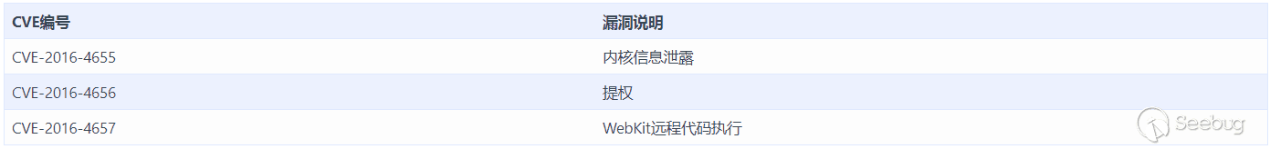 iOS三叉戟漏洞涉及3個0 day漏洞,其CVE編號及相關信息如下表所示: