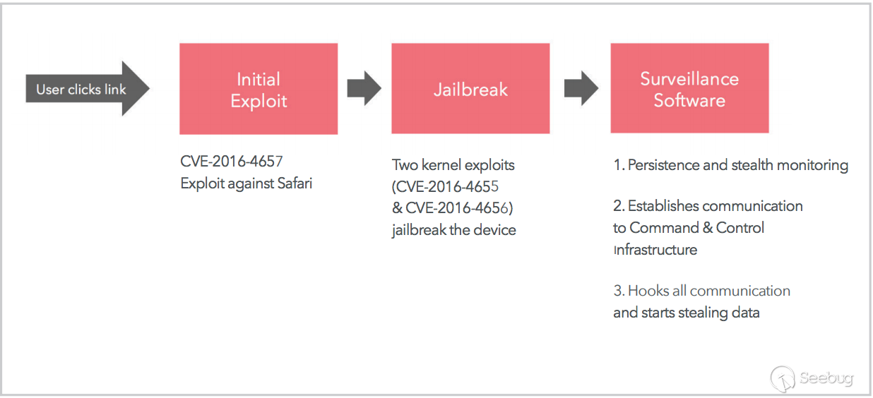 三叉戟漏洞的最初發現是因為阿聯酋一名重要的人權捍衛者Ahmed Mansoor在2016年8月10日和11日,其iPhone手機收到兩條短信,內容為點擊鏈接可以查看關于關押在阿聯酋監獄犯人遭受酷刑的秘密內容。其隨后將短信內容轉發給公民實驗室(Citizen Lab),由公民實驗室和Lookout安全公司聯合分析發現,最后發現該三叉戟漏洞和相關惡意載荷與著名的以色列間諜軟件監控公司NSO Group有關。