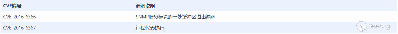 CVE-2016-6366(基于Cisco防火墻SNMP服務模塊的一處緩沖區溢出漏洞),目標設備必須配置并啟用SNMP協議,同時必須知道SNMP的通信碼,漏洞執行之后可關閉防火墻對Telnet/SSH的認證,從而允許攻擊者進行未授權的操作。