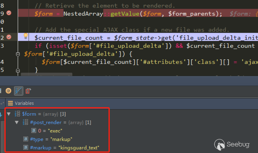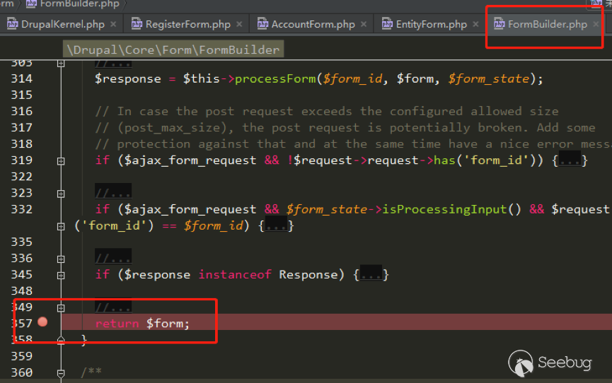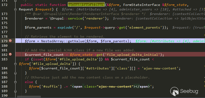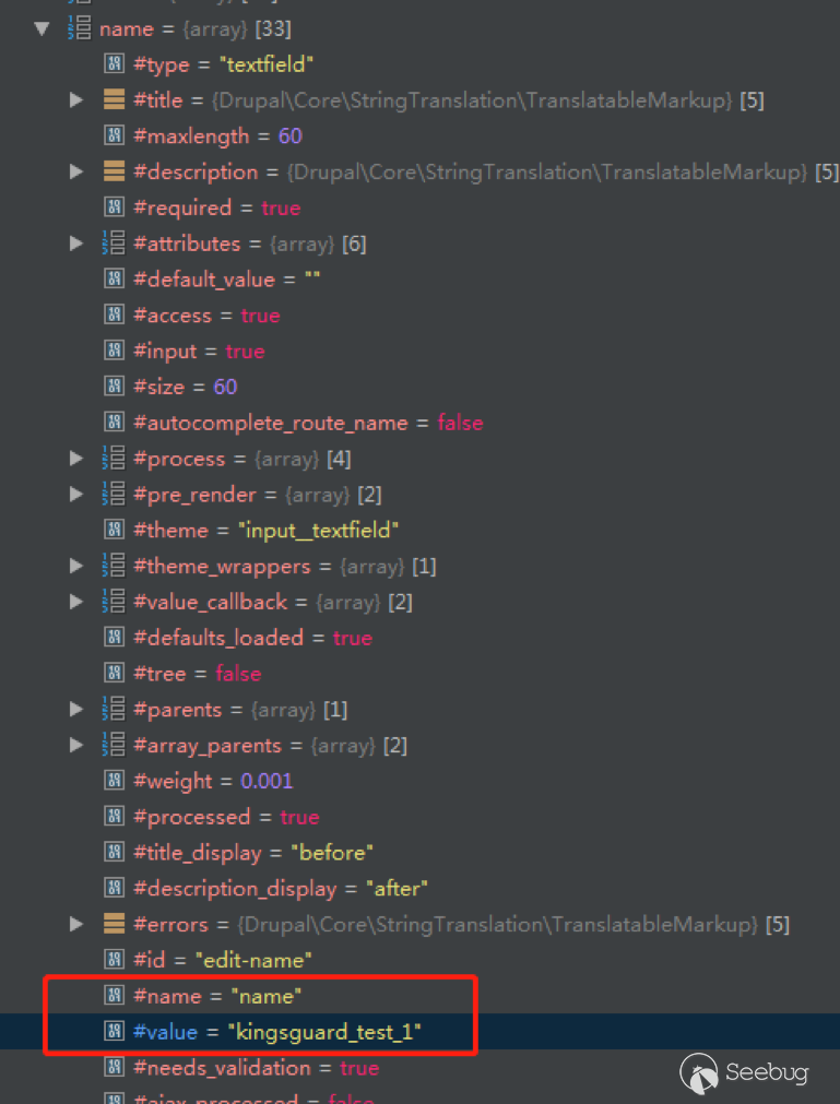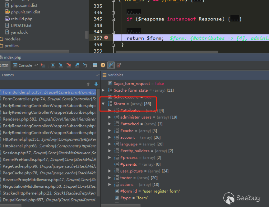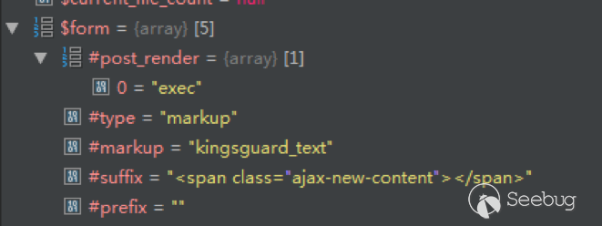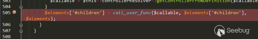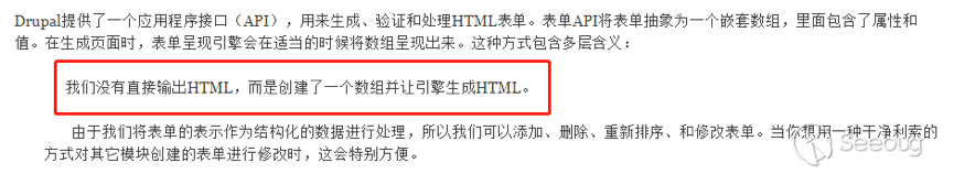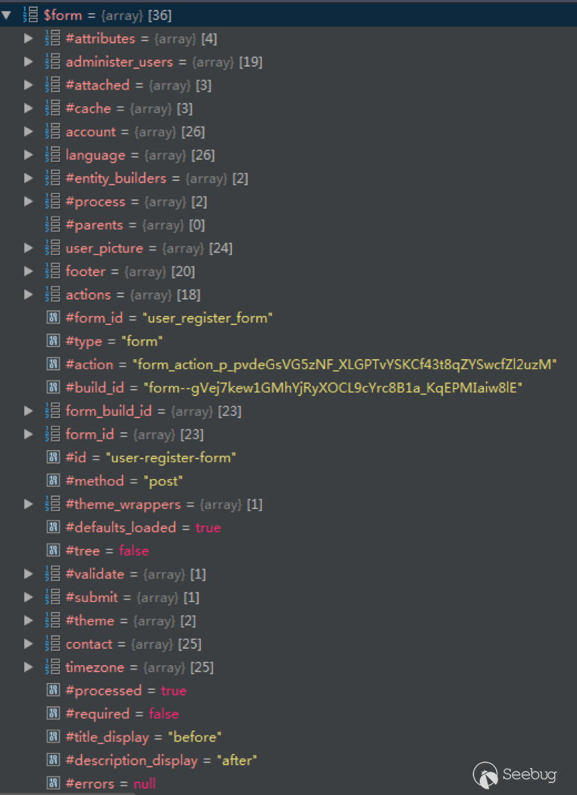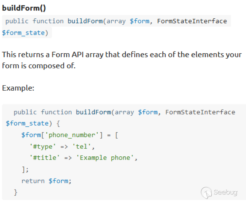 到這里,攻擊鏈已經很明確了,攻擊者傳入的值,可以通過buildform(方法構造表單數組,并且這個表單數組接下來還會被drupal表單呈現引擎解析為html頁面。