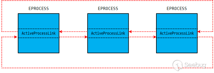 眾所周知的是,在 Windows 操作系統中,所有的進程體 EPROCESS 對象以各自的 LIST_ENTRY ActiveProcessLinks 成員域首尾相接,成員域 ActiveProcessLinks.Flink 指向下一個進程 EPROCESS 對象的 ActiveProcessLinks 成員域首地址,ActiveProcessLinks.Blink 指向上一個進程 EPROCESS 對象的 ActiveProcessLinks 成員域首地址。像這樣地,所有的進程組成一個龐大的環形雙向鏈表。獲得了 System 進程的 EPROCESS 對象基地址,就可以“順藤摸瓜”找到當前進程的 EPROCESS 基地址。