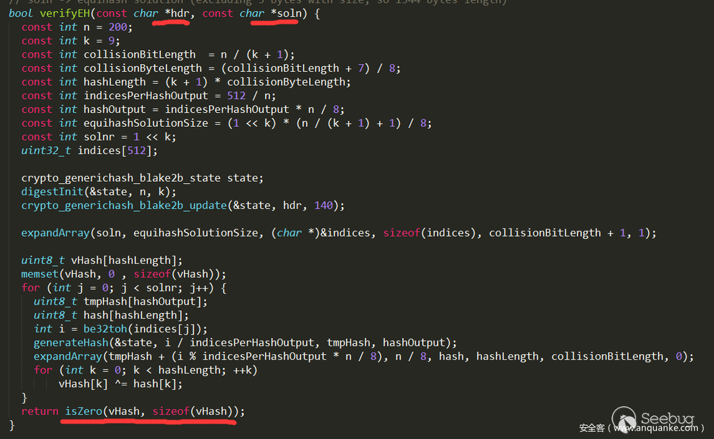 在equi.c文件中,在函數bool verifyEH(const char hdr, const char soln)中,hdr是區塊頭信息,參數soln是礦工求解出來的{Xij}序列。verifyEH函數的作用,就是用來判斷{Xij}是否是由區塊頭信息hdr產生的廣義生日悖論問題的正確解。
