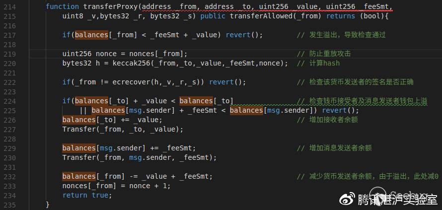 綜上所述,只有整個合約在允許交易且攻擊者帳號未被鎖定的情況下,攻擊者才能真正調用transferProxy函數。在參數處理過程中發生漏洞的原因可參見我們之前的分析文章:《SMT整型溢出漏洞分析筆記》。