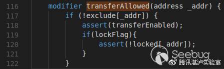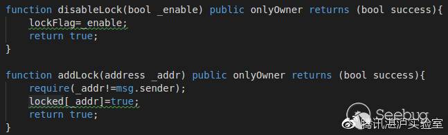 代碼119-121行對于交易發送者(即_from)帳號是否被鎖定進行了檢查,lockFlag和locked都只能被合約創建者所控制:
