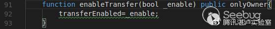 代碼118行判定transferEnabled標志符是否為true,該標志只能通過enableTransfer函數設定,且該函數只能被合約創建者調用,該函數的作用是使得ERC20合約的交易過程可控,這也是SMT等貨幣出現問題時能夠在后續中止交易的原因: