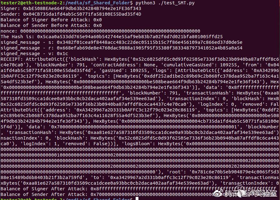 在節點2上,利用test_SMT.py腳本中的代碼可實現針對SMT合約的一鍵攻擊。