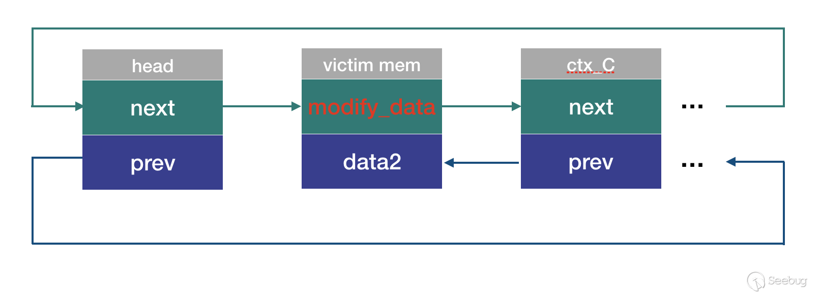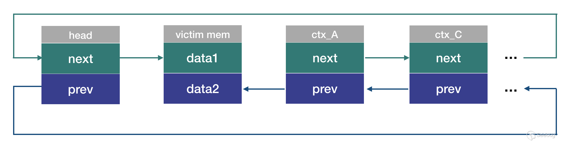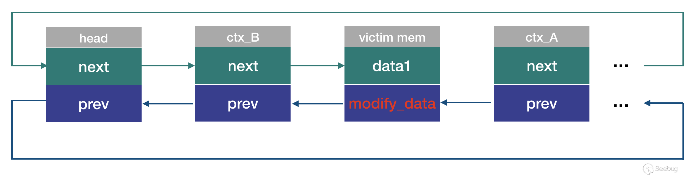可以看到,這個添加操作(list_add_rcu)會對已經free了的內存進行操作,會將victim_mem->data2賦值為ctx_B。語言總是沒有圖片來的直觀,添加操作執行后鏈表的狀態如圖: