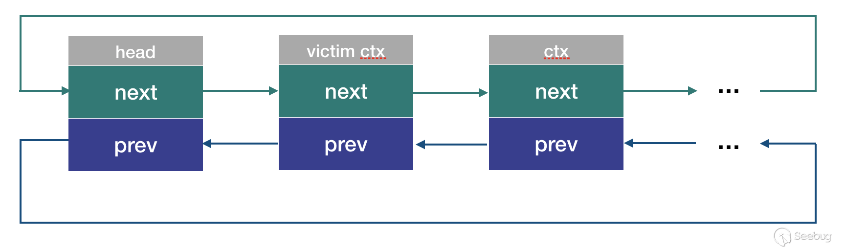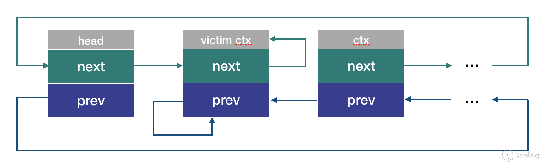 victim ctx已經被free,但是head->next和ctx_A->prev仍然保留著這段內存的指針。那么: