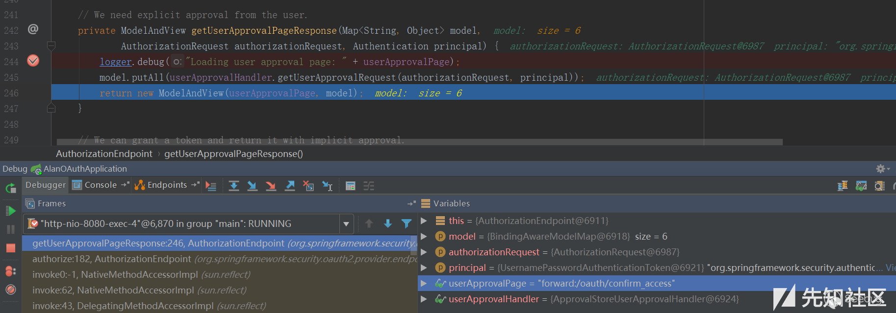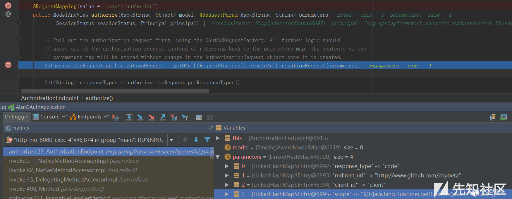 org/springframework/security/oauth2/provider/endpoint/AuthorizationEndpoint.java,這里貼上部分代碼: