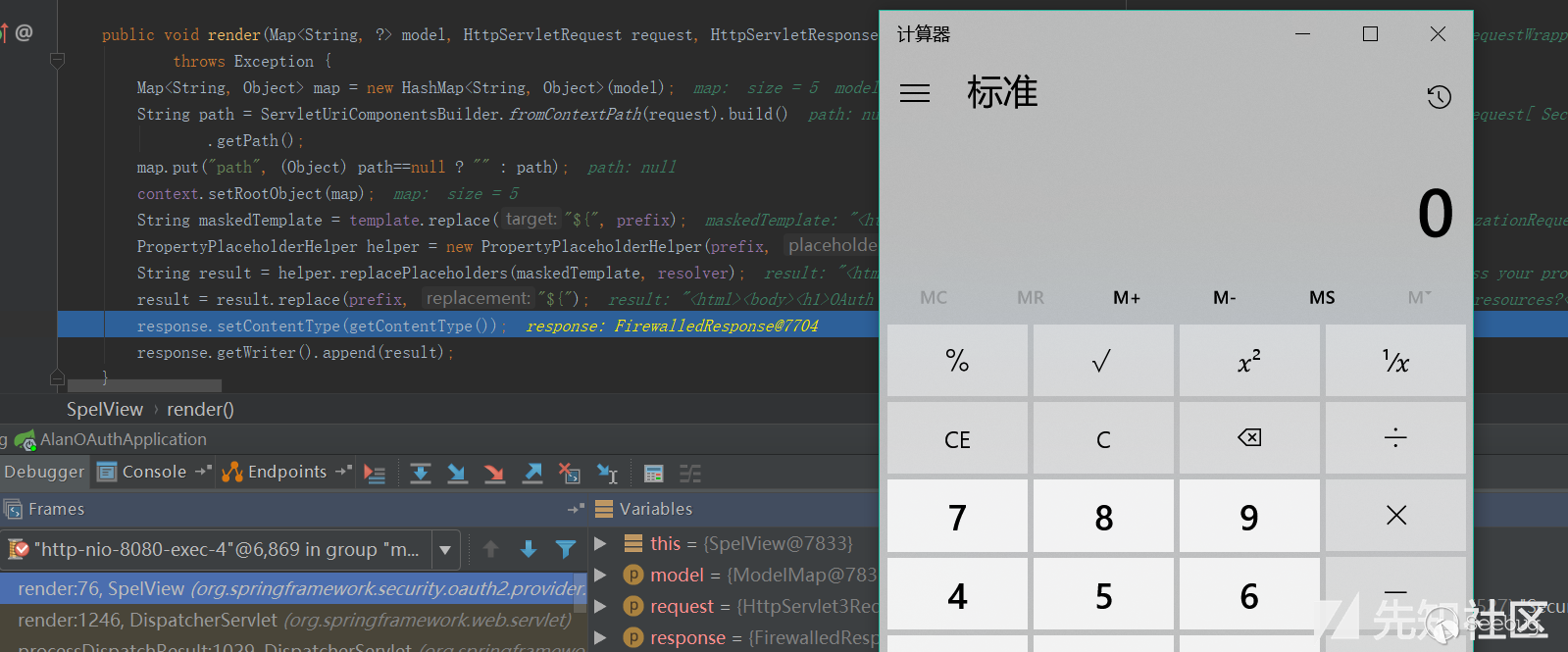 此后在頁面渲染的過程中,將會執行頁面中的Spel表達式${T(java.lang.Runtime).getRuntime().exec("calc.exe")}從而造成代碼執行。