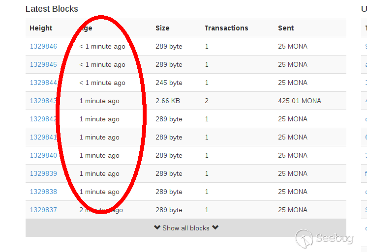 這可能是由于 Monacoin 的異常難度處理機制導致的,攻擊者在短時間內挖出了大量的塊,遠遠大于原來的1.5分鐘出塊時間。