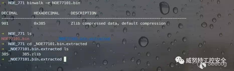 其次,使用Binwalk提取zlib壓縮的文件,如圖2所示。解壓后的文件385存儲在_NOE77101.bin.extracted目錄中,并以文件在固件升級包中的起始位置來命名。