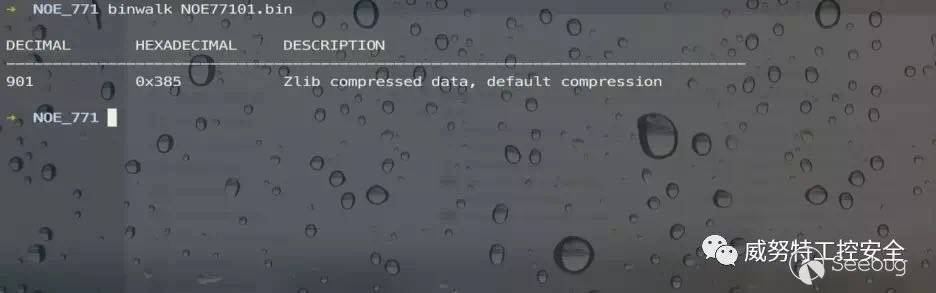 首先,使用Binwalk來確認該文件的壓縮類型,發現為zlib類型,如圖1所示。