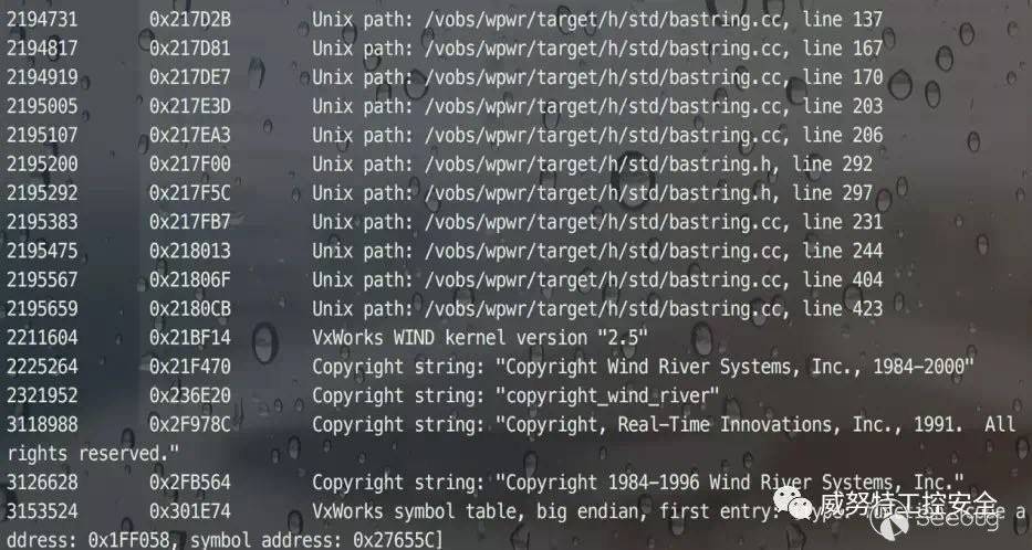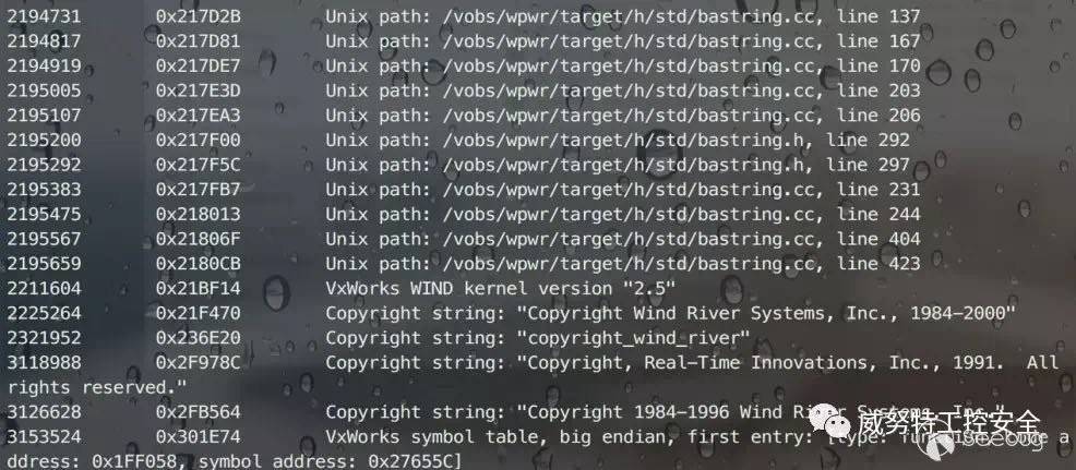 接著,使用Binwalk對385文件進行分析,發現固件中的一些路徑名、操作系統版本和符號表地址等關鍵信息。該固件的操作系統版本是VxWorks 2.5,可以結合VxWorks的源碼來進行逆向分析。該固件的符號表地址如圖4所示,符號表可以用來修復反匯編代碼中的函數名,詳見2.1.3節論述。