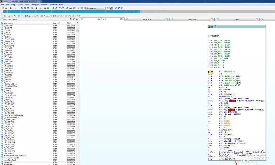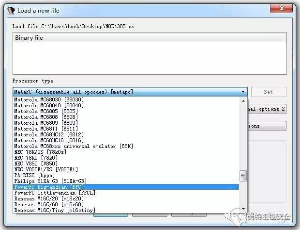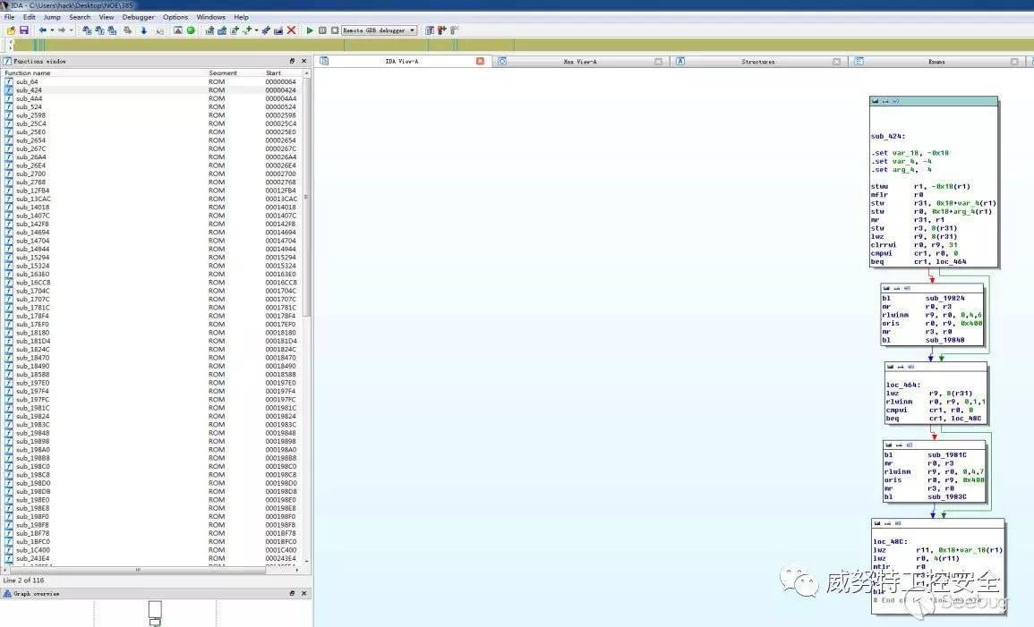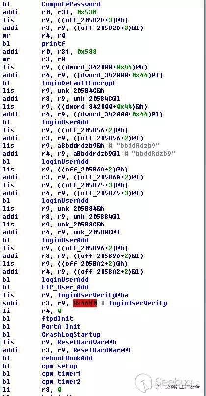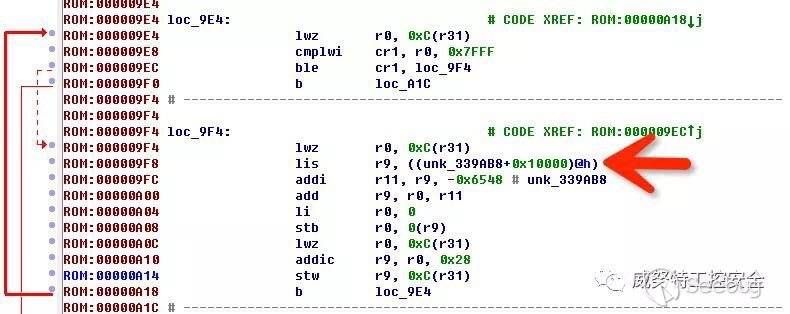 其次,使用IDA Pro加載PowerPC big endian架構的反匯編引擎進行分析。