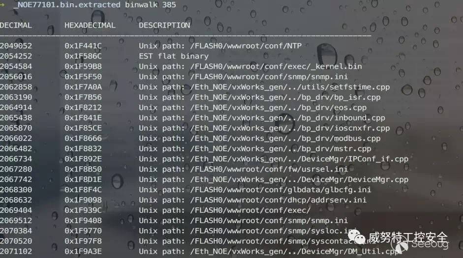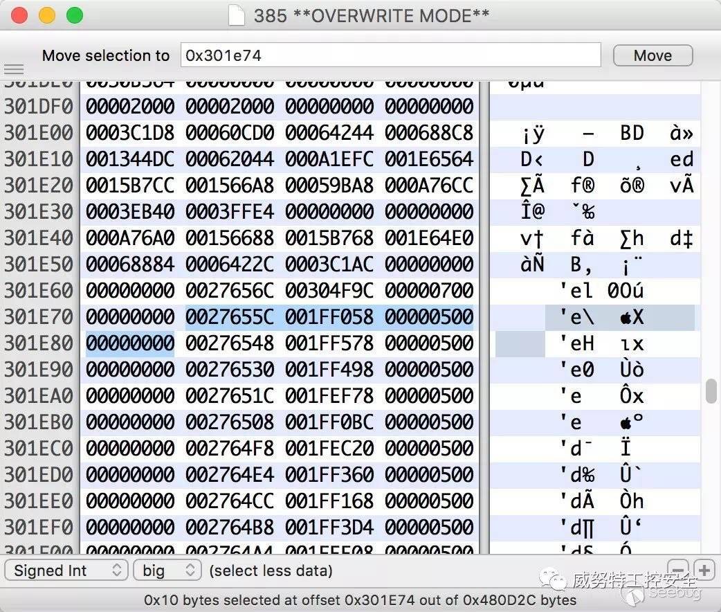 VxWorks系統的符號表包含了函數及函數名的對應關系,因此我們的第一步是要找到符號表在固件中的位置。之前使用Binwalk分析固件時,已經發現了固件中的符號表位置為0x301E74。