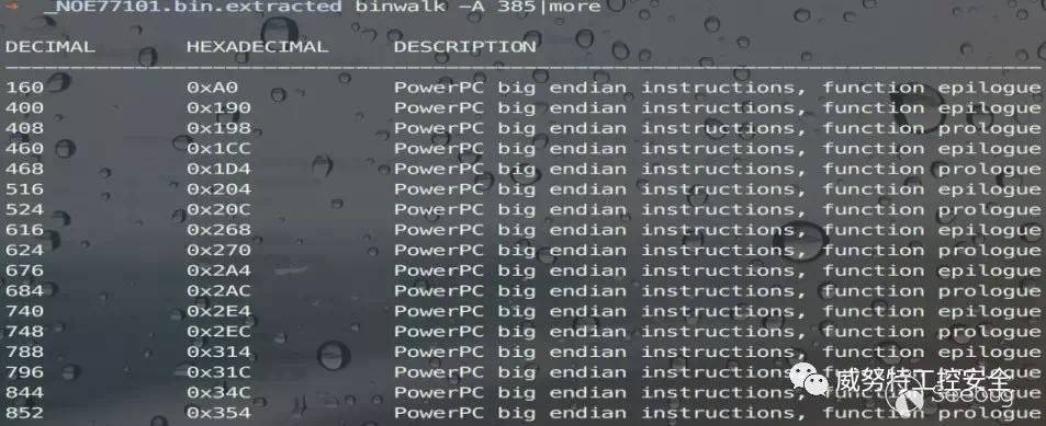 首先,使用Binwalk - A命令來獲取目標固件的CPU架構等信息,該信息有助于選擇正確的反匯編引擎,如圖5所示目標固件的CPU架構為PowerPC big endian。