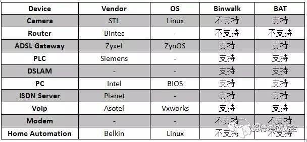 固件的識別和解壓,可以借用一些成熟的工具軟件,如:Binwalk、BAT(Binary Analysis Toolkit)等。Binwalk和BAT均為比較流行的固件映像提取和分析工具。Binwalk以MIT License發布,BAT以GPL License發布。它們支持的固件映像解壓格式對比表如下: