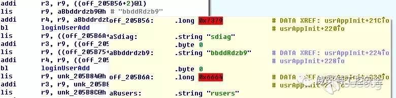 查看usrAppInit函數,可以發現大量的loginUserAddd調用,如圖15所示。同時可以發現多個后門賬號,如圖16所示。
