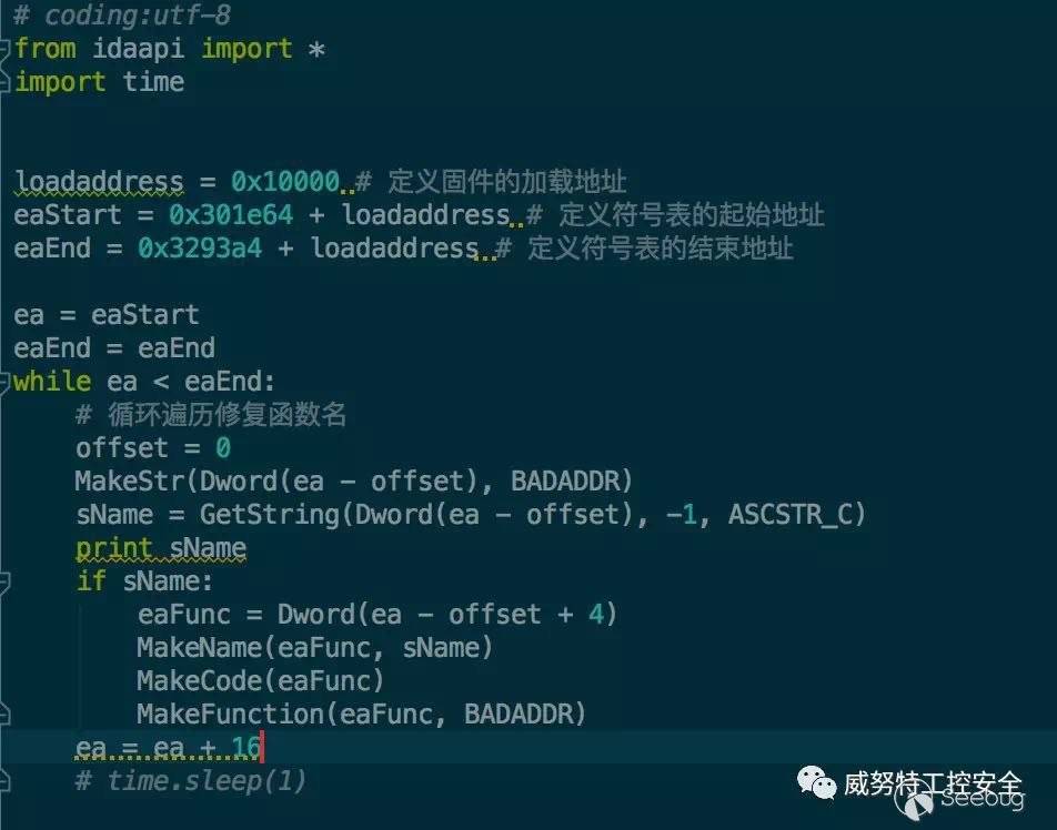 在得到了符號表的位置后,我們需要使用IDA Pro的API來修復函數名,這里將使用如下的Python腳本。