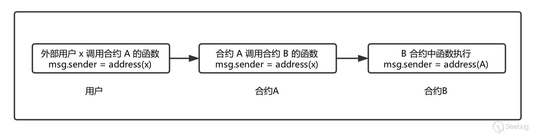 call 注入引起的最根本的原因就是 call 在調用過程中,會將 msg.sender 的值轉換為發起調用方的地址,下面的例子描述了 call 注入的攻擊模型。