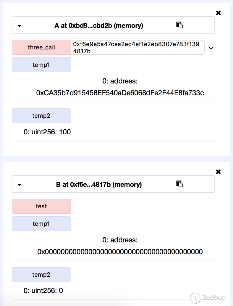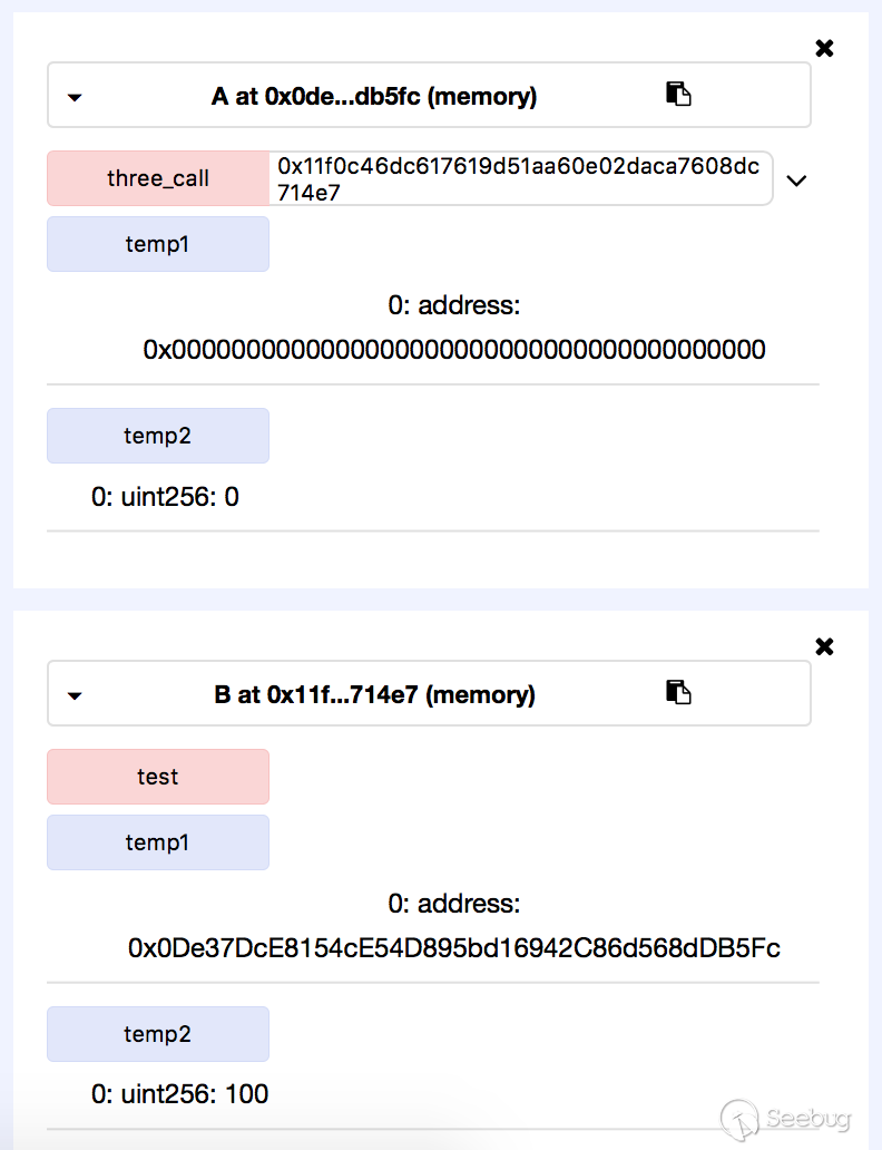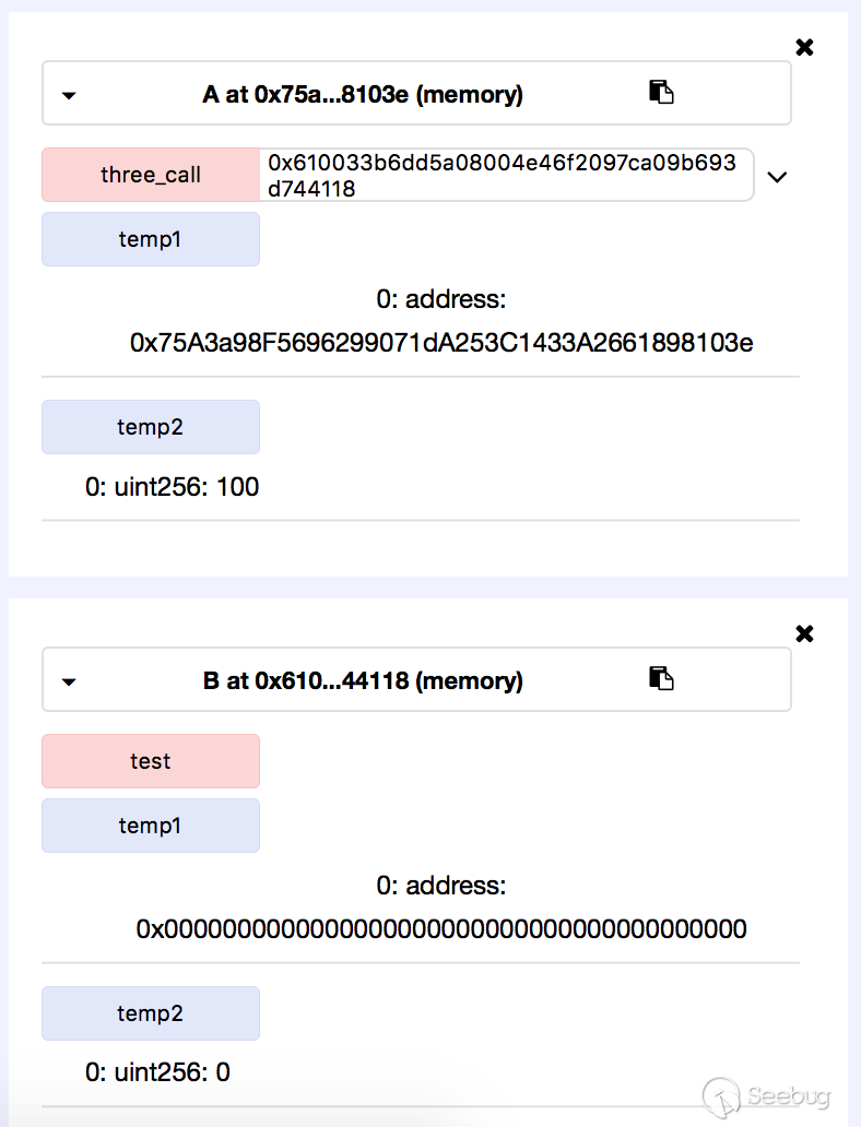 現在調用語句1 call 方式,觀察變量的值發現合約 A 中變量值為 0x0,而被調用者合約 B 中的 temp1 = address(A), temp2 = 100: