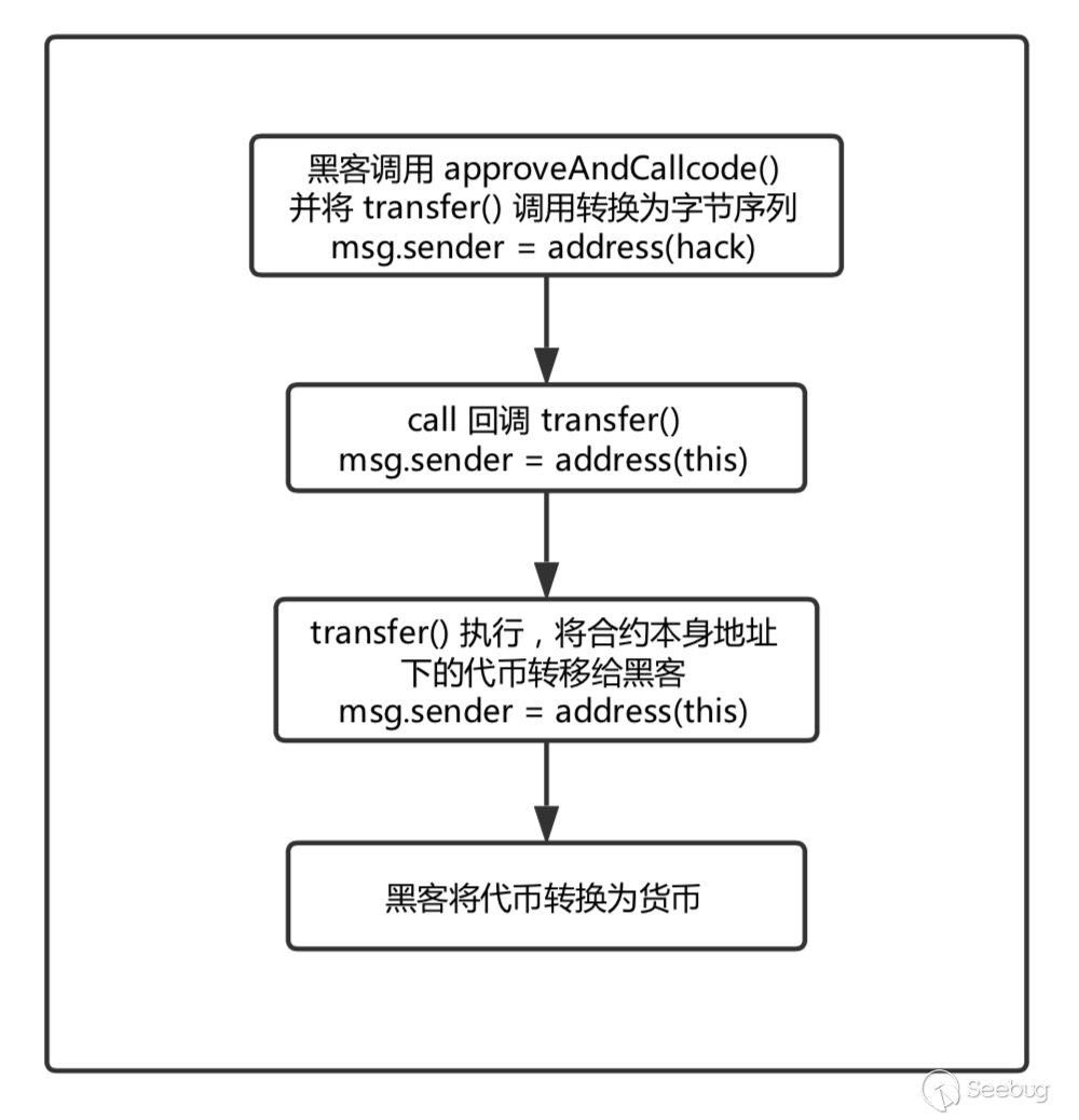 黑客通過調用 approveAndCallcode() 函數,將合約地址作為 _spender 參數,并將 transfer() 的調用轉換為字節序列作為 _extraData 參數,最終調用 transfer() 函數。在 transfer() 函數中,_to 參數為黑客的地址,而此時 msg.sender 的值已經是合約本身的地址了,黑客通過這種方式,成功竊取了合約地址中的代幣。
