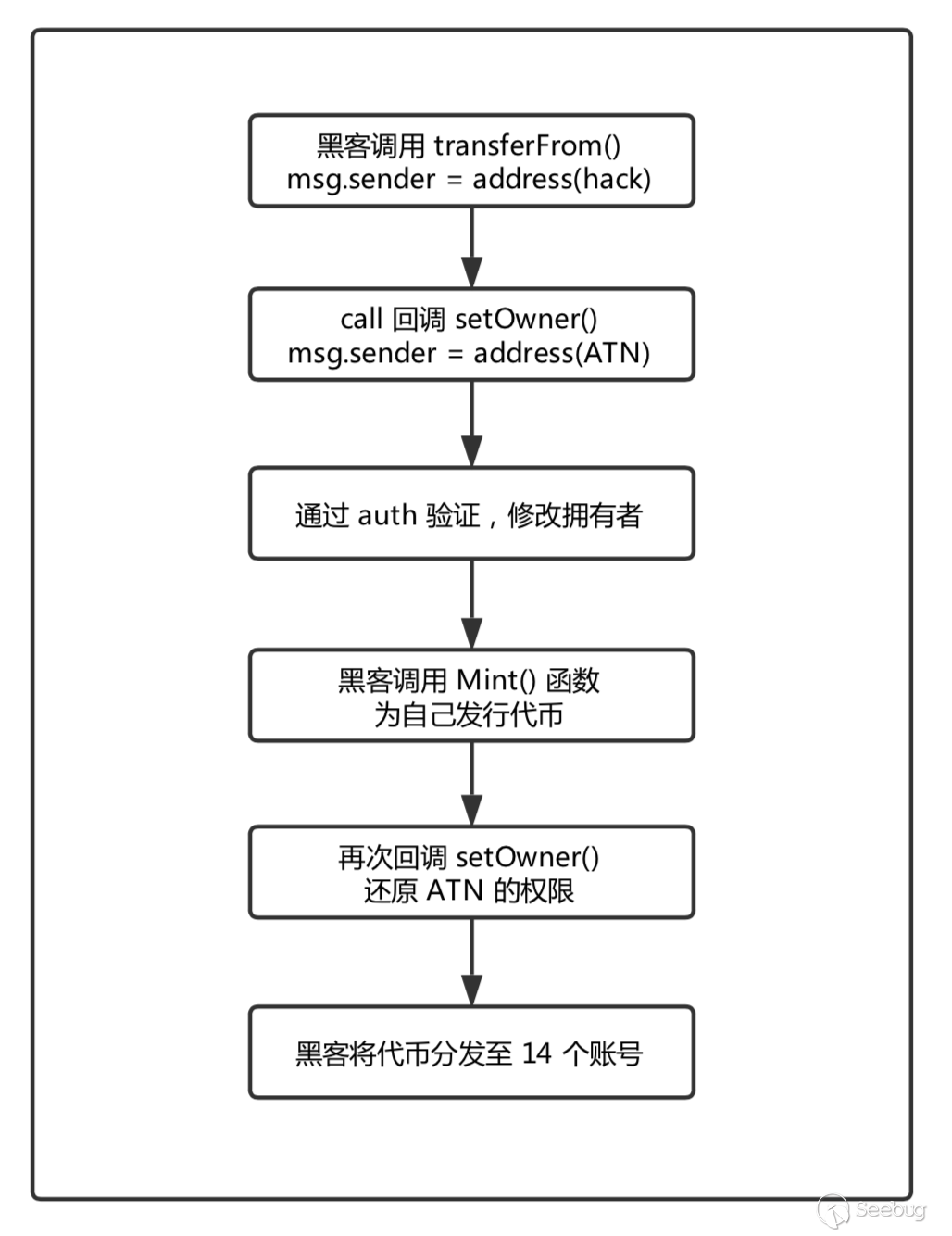 黑客通過調用 transferFrom() 函數,并傳入黑客自己的地址作為 _from 參數, ATN 合約的地址作為 _to 參數,并傳入 setOwner() 作為回調函數;在執行過程中,由于 call 調用自動忽略多余的參數,黑客的地址將作為 setOwner() 的參數成功執行到函數內部,與此同時,call 調用已經將 msg.sender 轉換為了合約本身的地址,也就繞過了 isAuthorized() 的權限認證,黑客成功將合約的擁有者改為了自己;隨后調用 Mint() 函數為自己發行代幣,最后黑客再次調用 setOwner() 將權限還原,企圖銷毀作案現場。