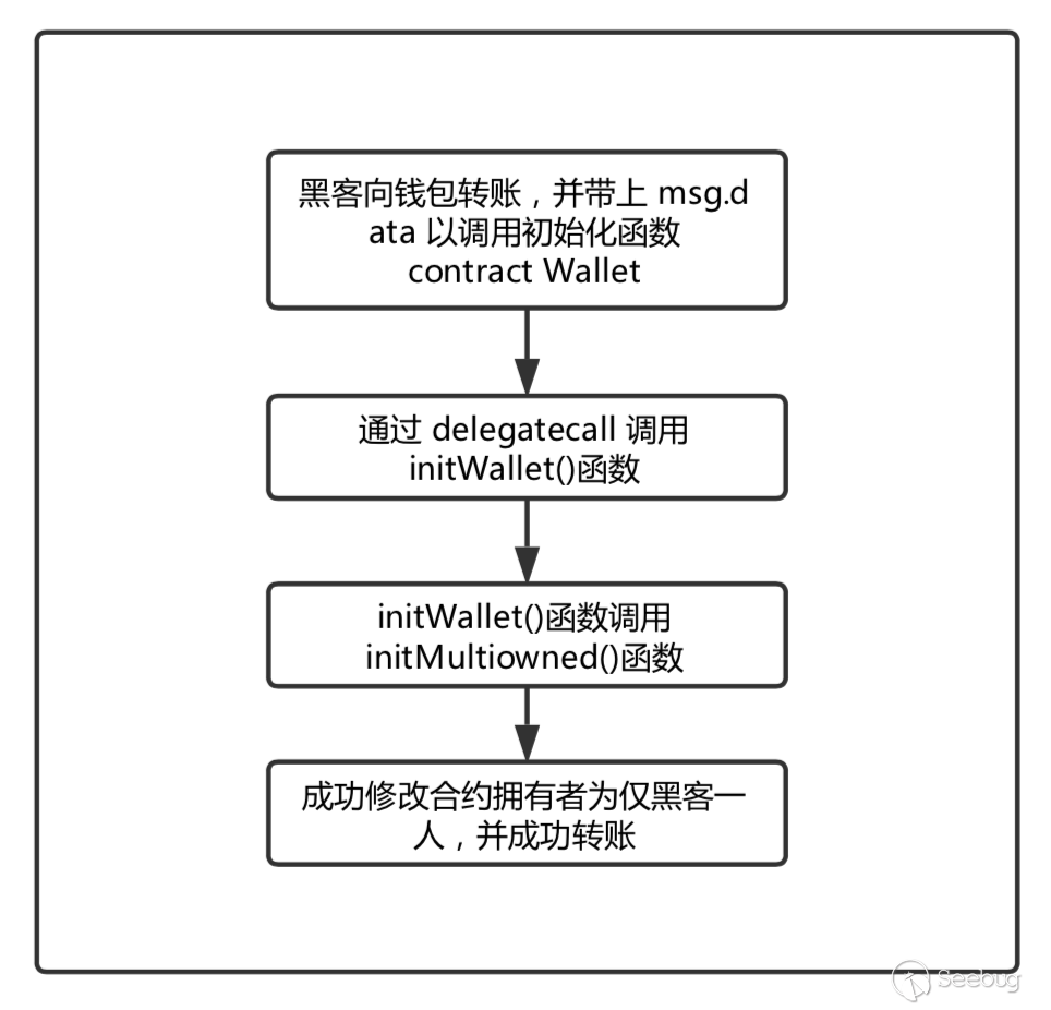 其中錢包初始化函數 initMultiowned() 未做校驗,可以被多次調用,存在安全隱患,但由于其位于 WalletLibrary 合約下,是不能直接調用的。黑客利用 Wallet 合約中的 delegatecall 調用 WalletLibrary 合約的 initWallet() 函數,初始化整個錢包,將合約擁有者修改為僅黑客一人,隨后進行轉賬操作。
