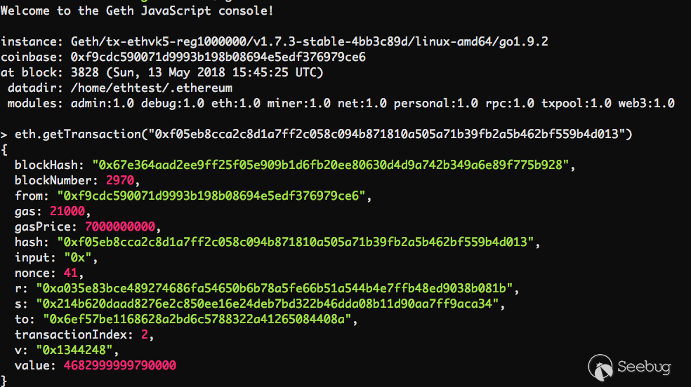 我們通過geth日志獲取交易hash,在console中查看詳細信息。